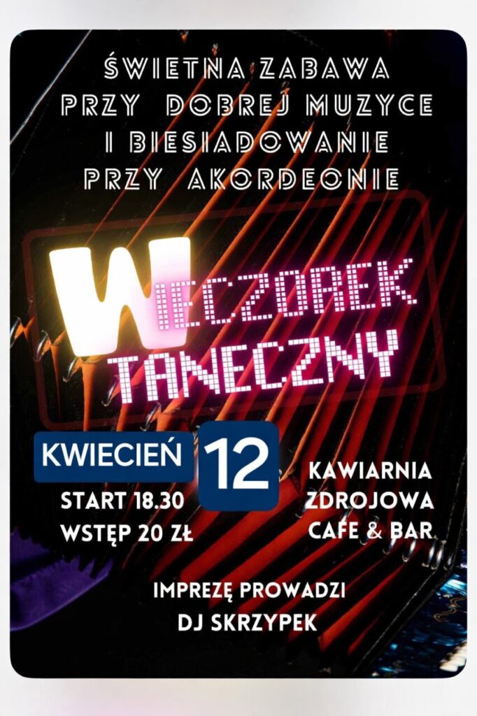Zabawa przy dobrej muzyce i biesiadowanie przy akordeonie z DJ Skrzypek, start 19:00, wstęp 20 zł.